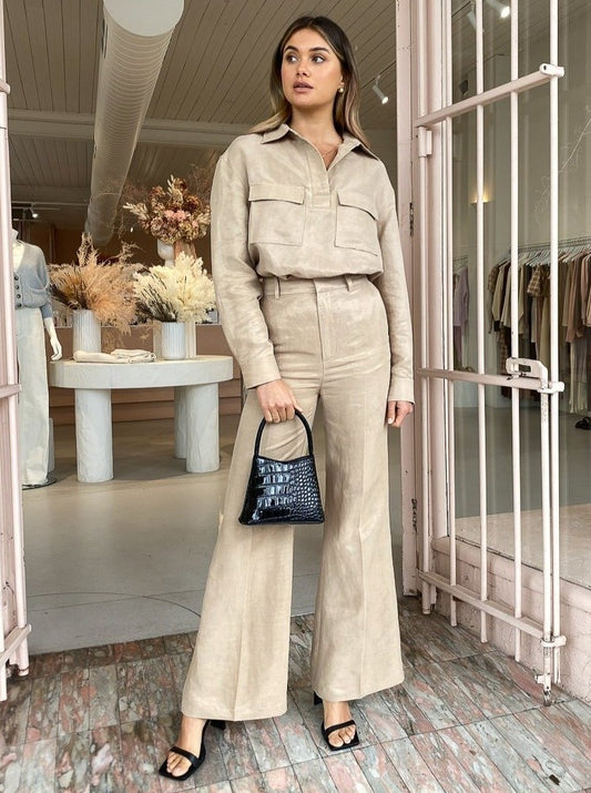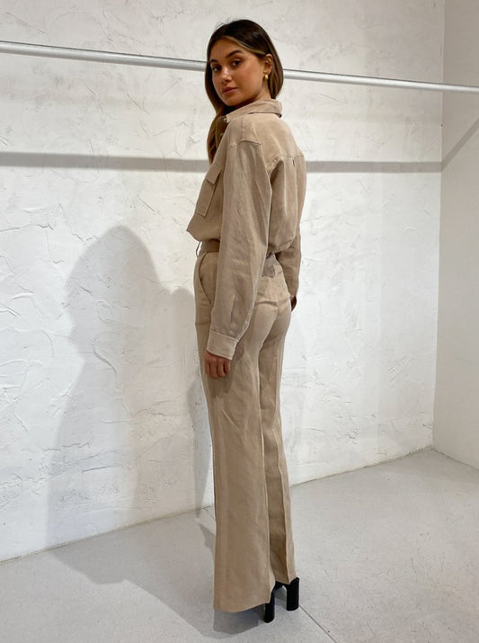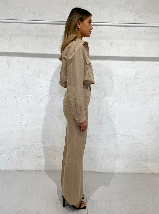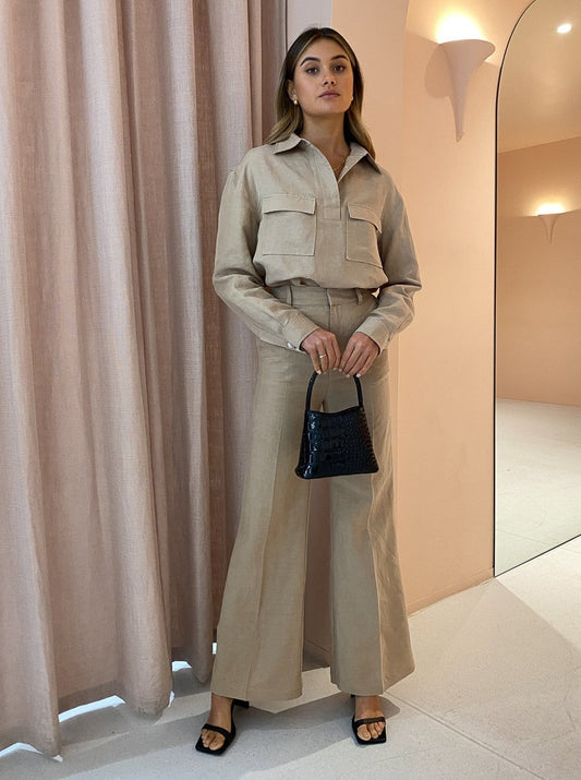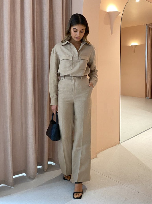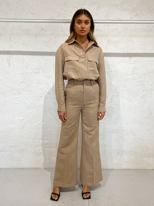 A high waisted trouser with functioning side pockets, they're the go to transeasonal neutral trouser for your wear on repeat wardrobe.