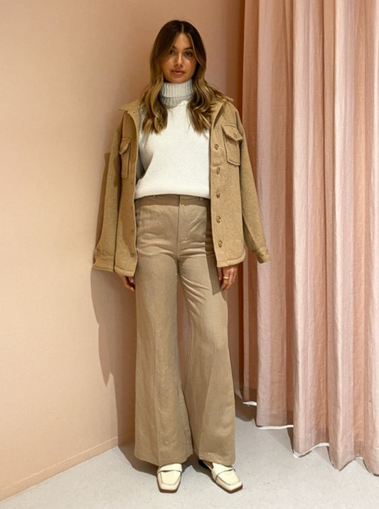 Coco Styling Tip: Feel effortlessly fabulous in this complete tonal monochrome style matching back the trucker jacket with the Ena Pelly Roll Neck Knit in Snow, the Third Form Street Smart Trouser in Natural and the Manning Cartel Future Moves Loafer in Vanilla