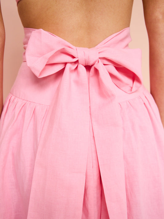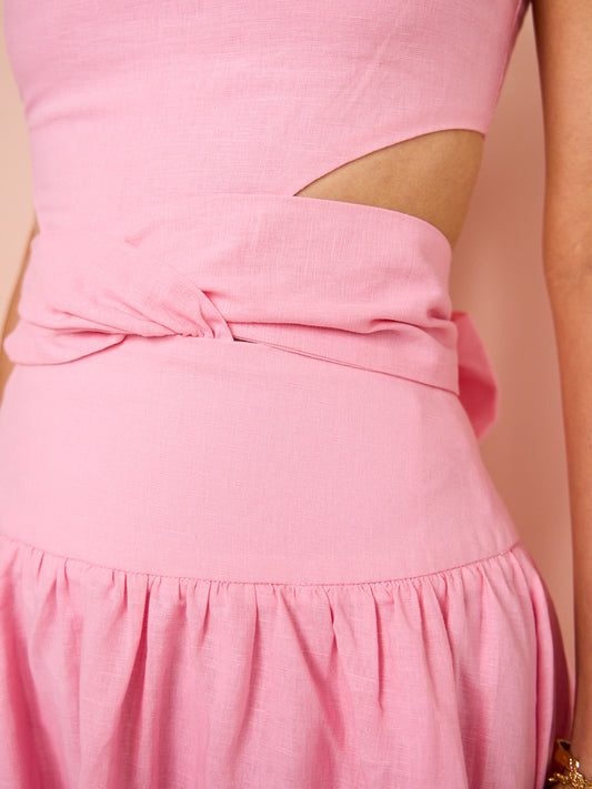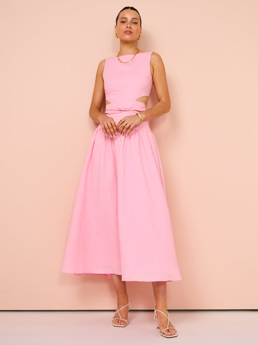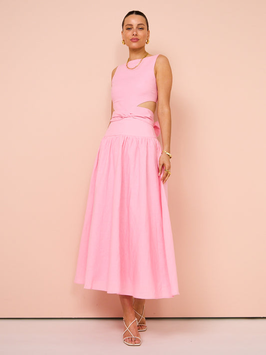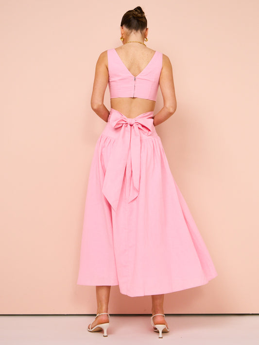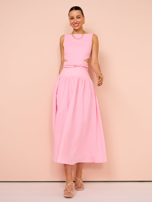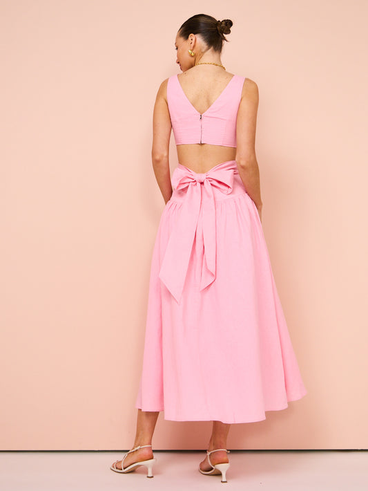 Crafted from a linen cotton blend, this long-line maxi dress is tailored to fit the bust with a center back zip and long-length waist ties made to wrap and tie at the back. A large waistband panel gracefully cascades into a full A-line skirt silhouette, complete with an elegant center back zip.
