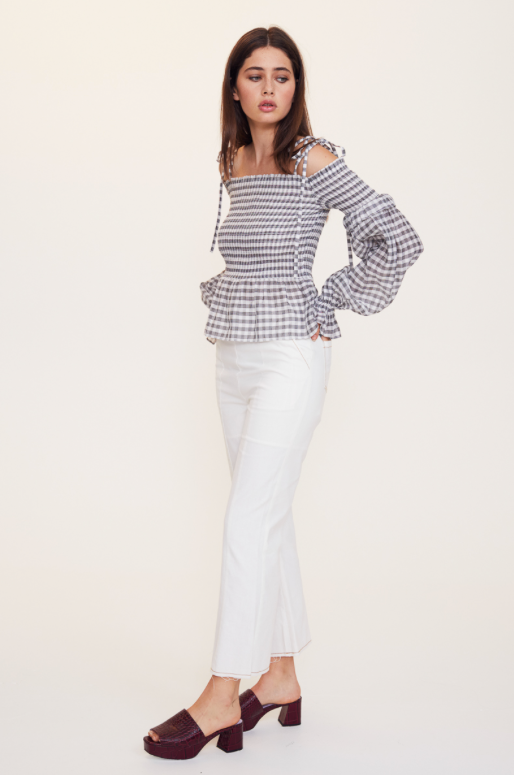 This check printed top is an off the shoulder shape with tie detail, shirred bodice and voluminous sleeve.