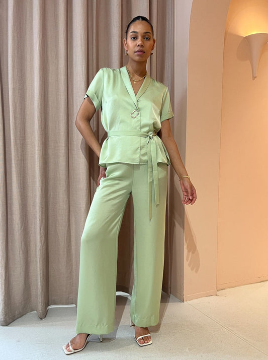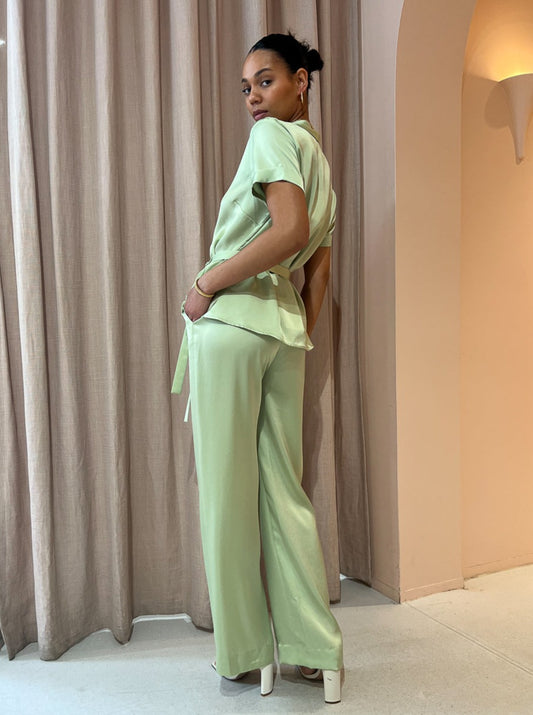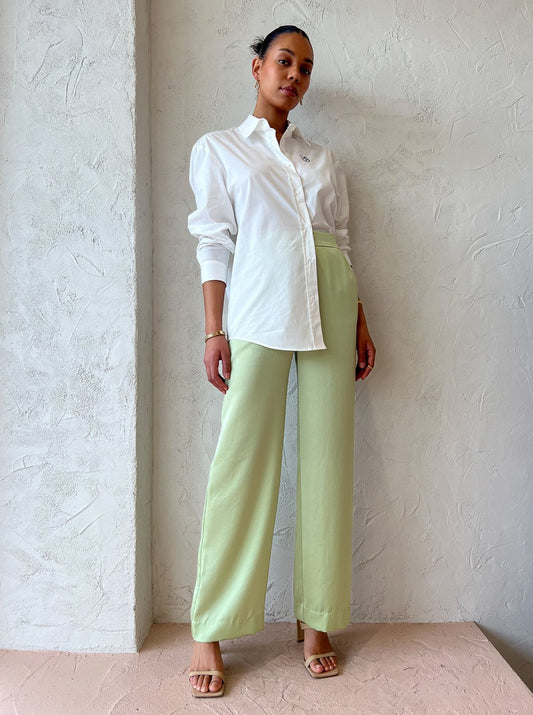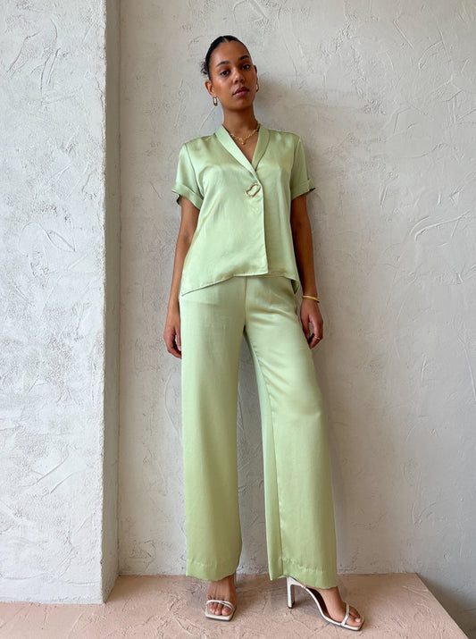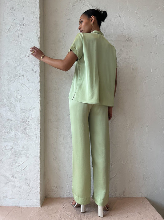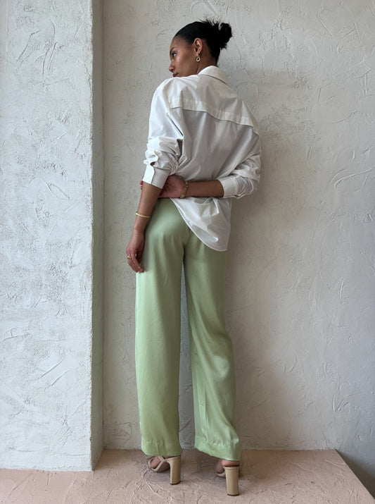 Loved for their sweet green hue and style versatility these luxurious pants can be styled for relaxed occasions or paired with the matching shirt for elevated soirees.