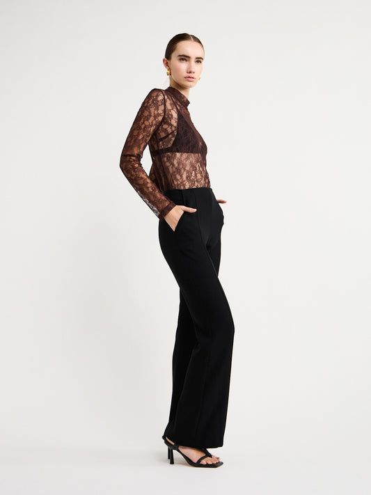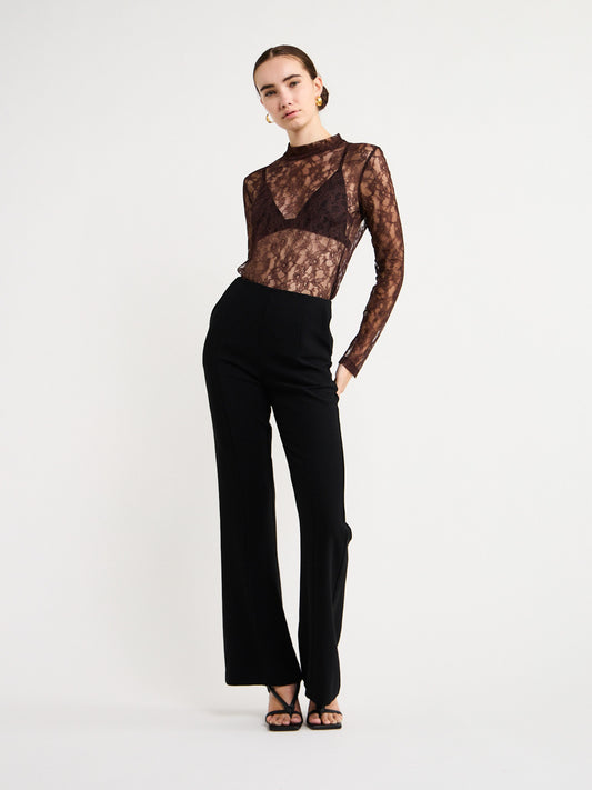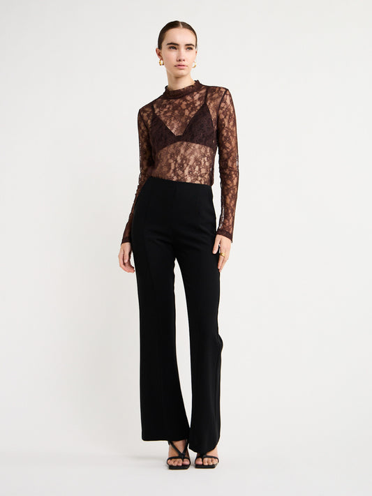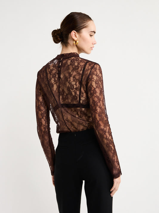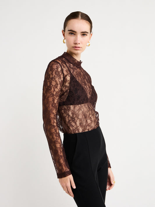 Luxuriously crafted in sheer chocolate brown lace, the Kindred Skivvy's features a turtle neck silhouette, bust darts, and slightly fitted long sleeve create a sleek and sophisticated finish, while the cover stitch hems and back neck button opening with self rouleau loops provide comfort.