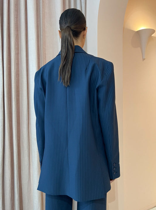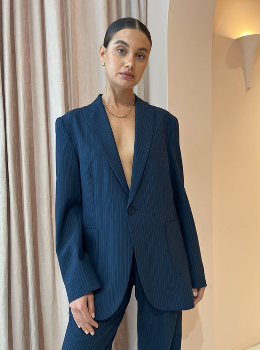 Carefully crafted from a reimagined wool fabrication showing a subtle navy pinstripe, this longline blazer with an oversized shape features jet pockets and is finished with a single-button front closure.