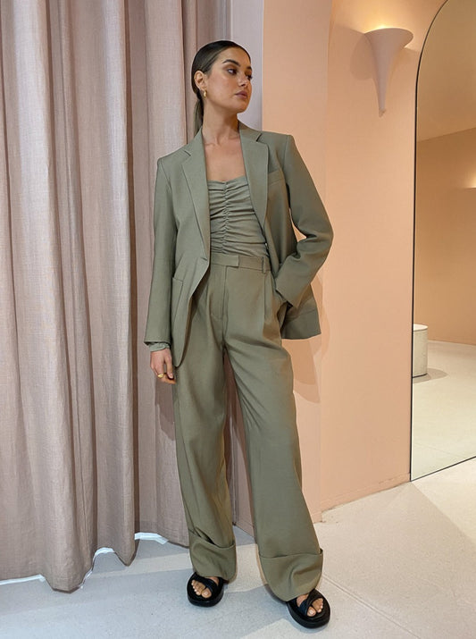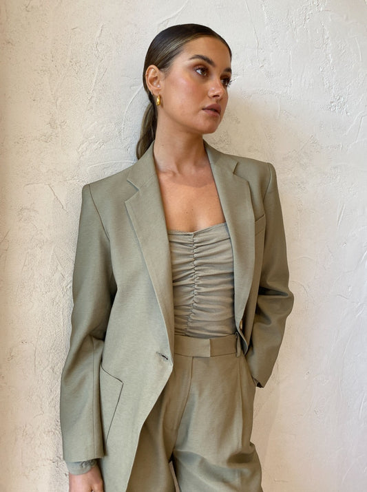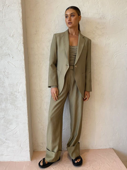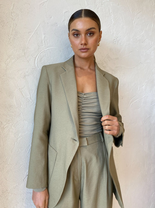 Epitomise neutral styling for your trans-seasonal wardrobe with Viktoria & Woods Rebellion Blazer in Olive.