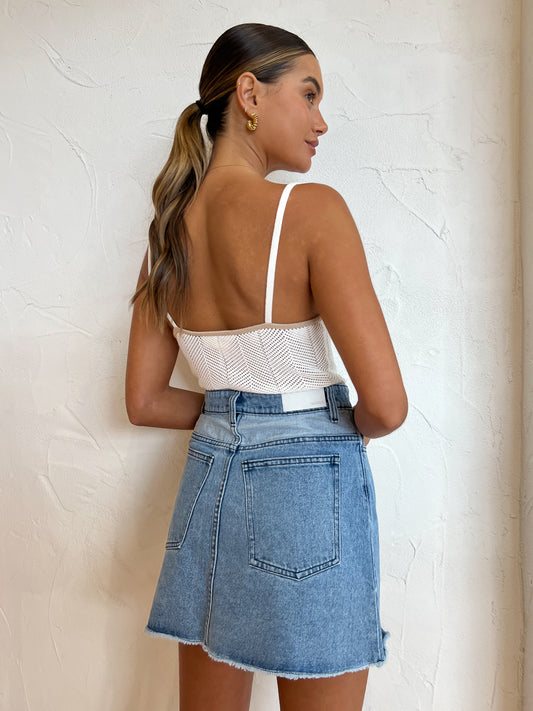 Carefully constructed with mixed crochet knitting, this singlet top is crafted from a breathable Linen Cotton blend in Ivory. Designed to flatter the femme silhouette it's cut with a sweetheart neckline, tubular shoulder straps and contrast tipping at the neckline and hem.